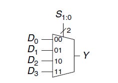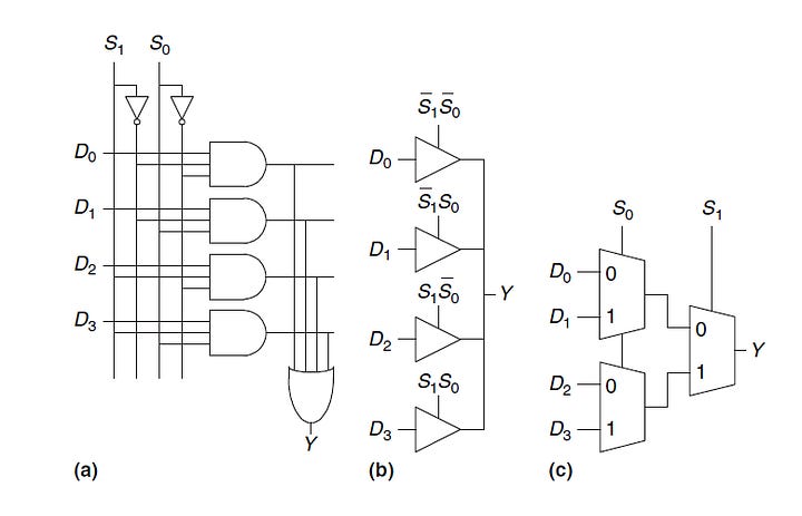 For example a 4 to 1 multiplexer has four data inputs and one output, as shown in. Two select signals are needed to choose among the four data inputs. The 4:1 multiplexer can be built using sum-of-products logic,tristates, or multiple 2:1 multiplexers. The product terms enabling the tristates can be formed using AND gates and inverters.