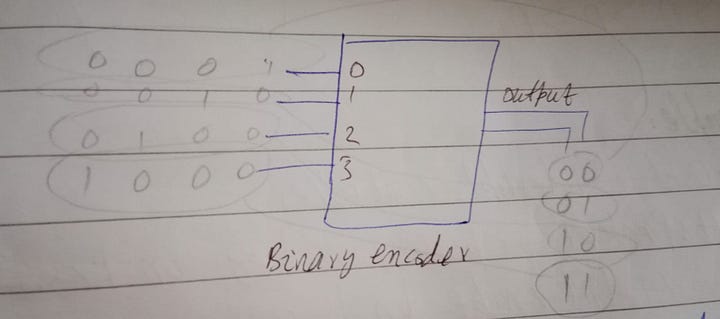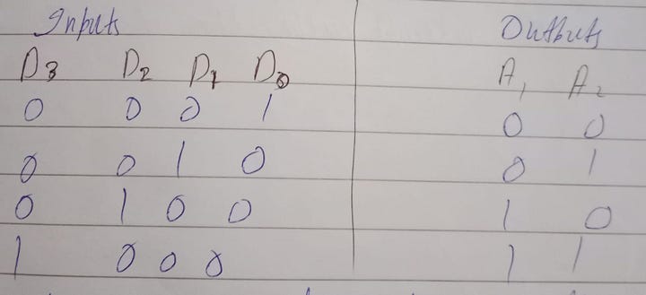 3. Encoders: Encoders perform the reverse operation of decoders. They take 2^n input lines and convert them into an 'n' bit binary code. Encoders are commonly used in applications where multiple input lines need to be reduced to a simpler binary code for further processing such as keyboard encoding, decimal to binary converters etc. For example in decoder we had 2 inputs and 4 outputs but in encoder we will have 4 binary inputs and 2 outputs. We assume that only one of the input is 1(High) at a time and all other are false.