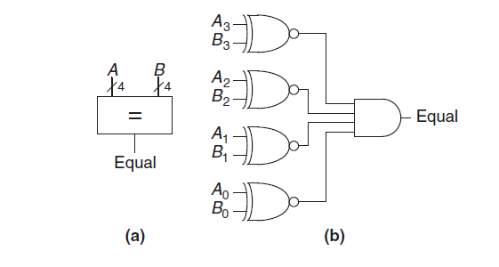 The equality comparator is the simpler piece of hardware. It first checks to determine whether the corresponding bits in each column of A and B are equal using XNOR gates. The numbers are equal if all of the columns are equal.