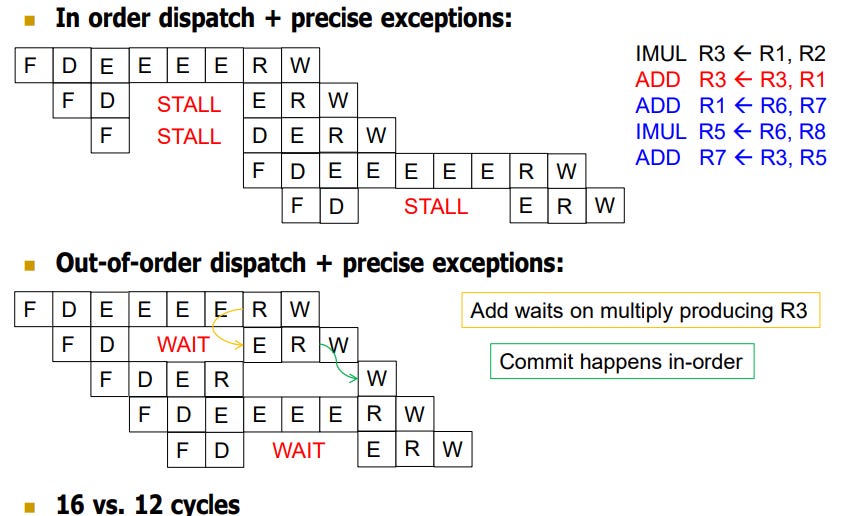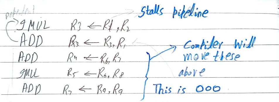 IMUL instruction stalls the pipeline as the next instruction ADD is dependent on results of r3. In OOO the compiler will move the other 3 instructions above as they are independent and process them first.